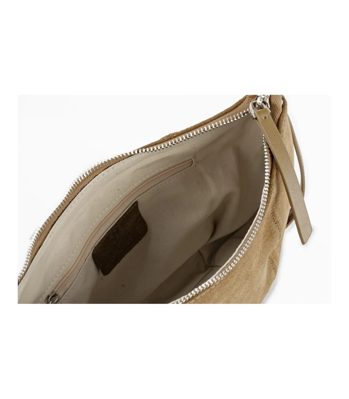 WE LOVE SUEDE!, ligero con estructura blanda. Interior forrado en mezcla de poliéster con acabado mate y compartimento abierto interior rematado con un ribete en piel; bolsillo interior con cierre de cremallera.