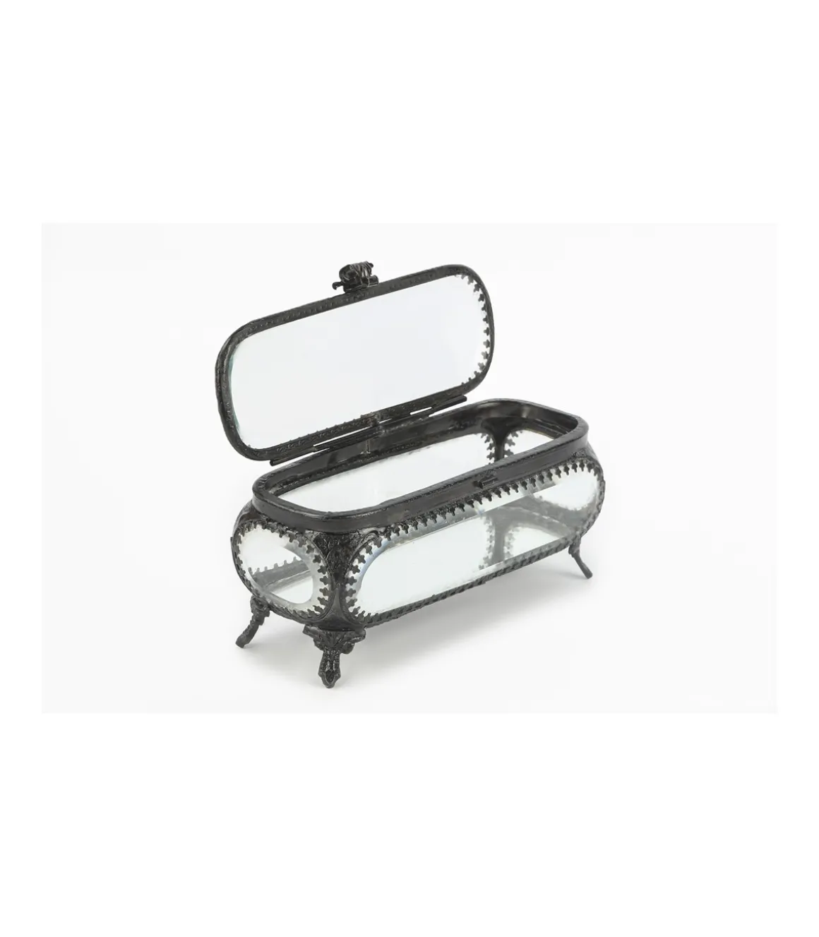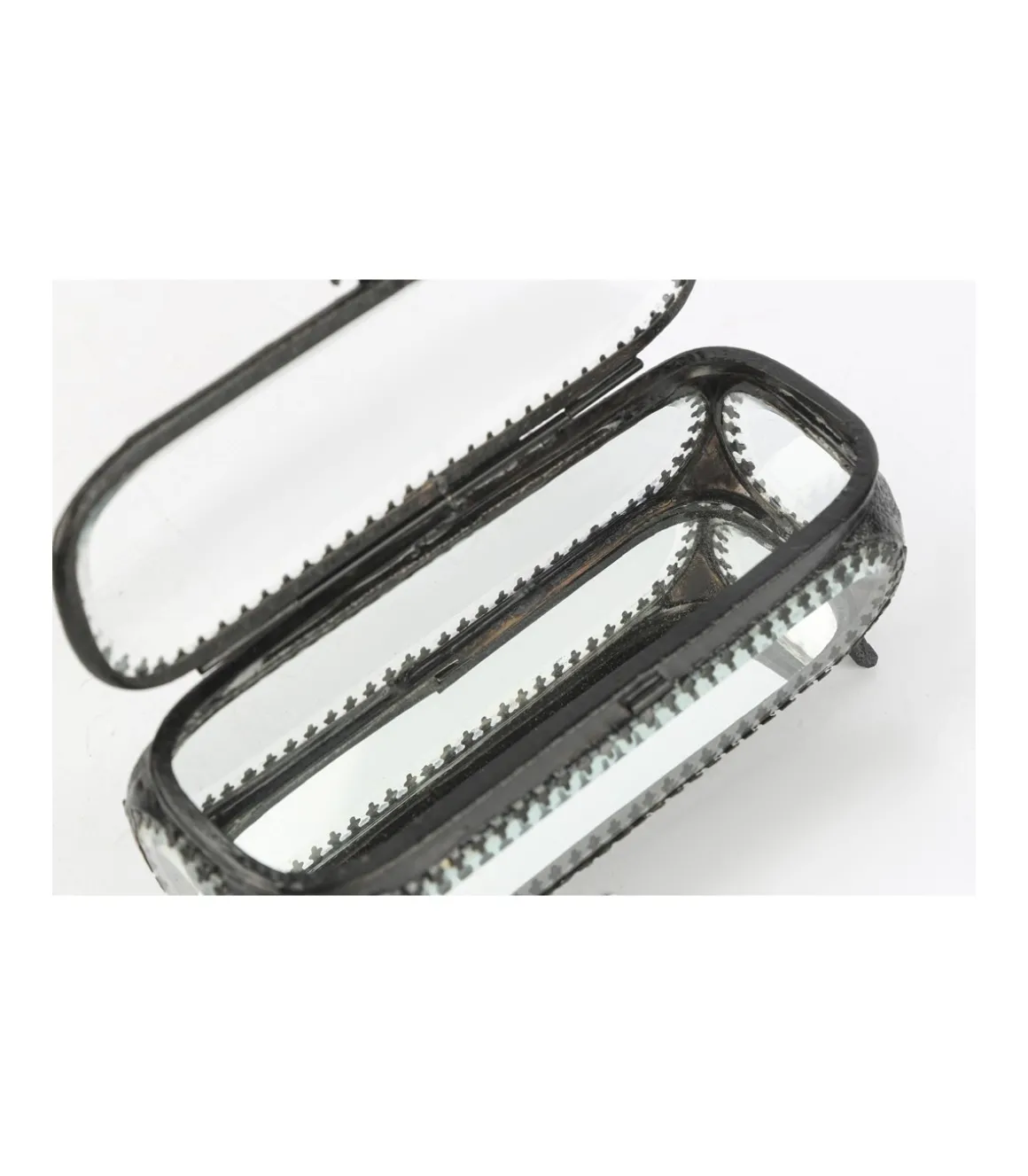 Caja joyero con incrustaciones de latón y cristal biselado, hecho a mano con diseño vintage. Base de espejo y tapa con cierre.