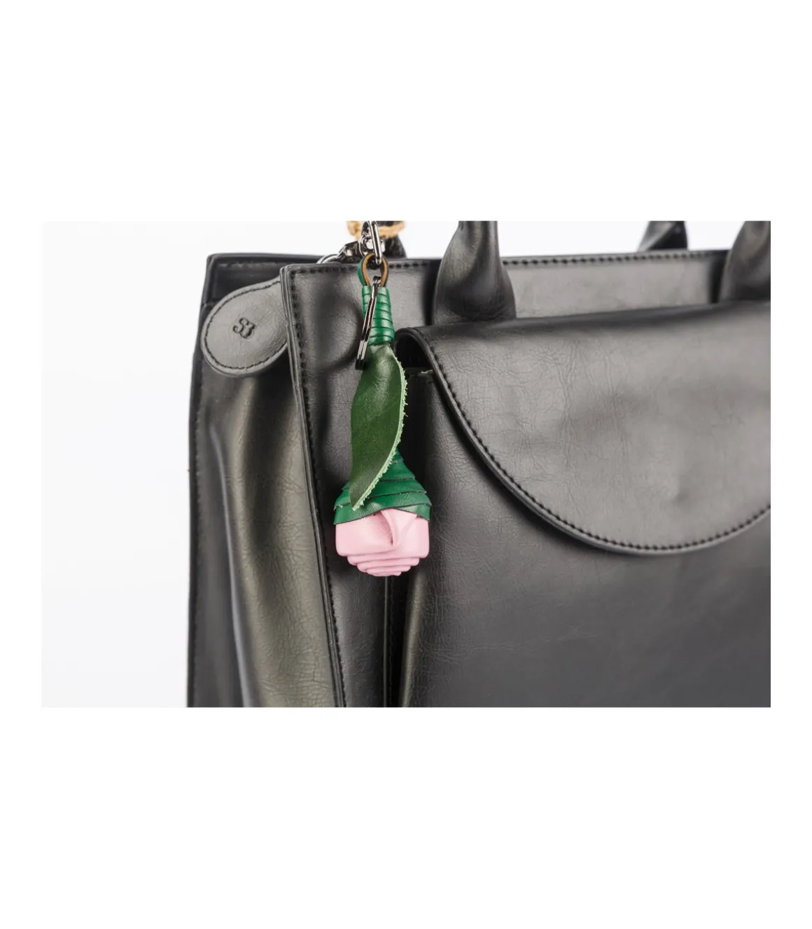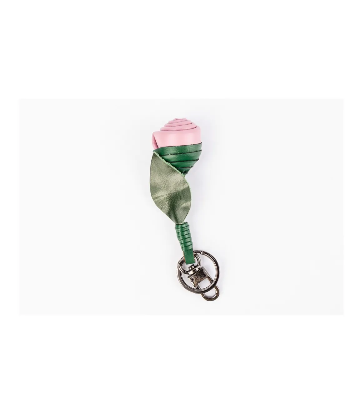 Llavero flor fabricado en piel vacuno y piel sintética. Con enganche con mosquetón y aro para las llaves. Es el regalo ideal.