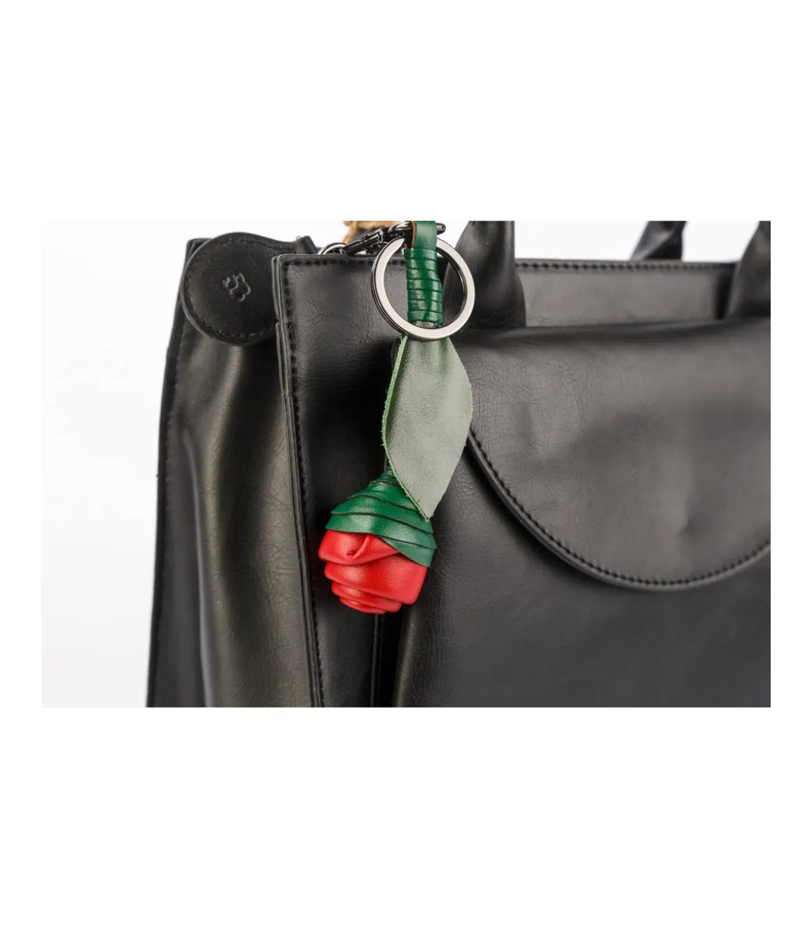 Llavero flor fabricado en piel vacuno y piel sintética. Con enganche con mosquetón y aro para las llaves. Es el regalo ideal.