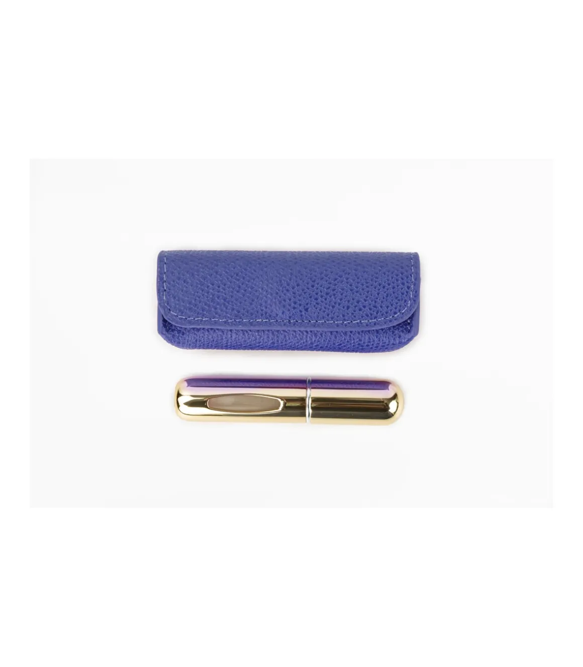 Estructura reforzada para evitar deformaciones. Interior forrado en piel de vaciuno que cambia en función del tono exterior. Incluye un perfumador recargable en color dorado.