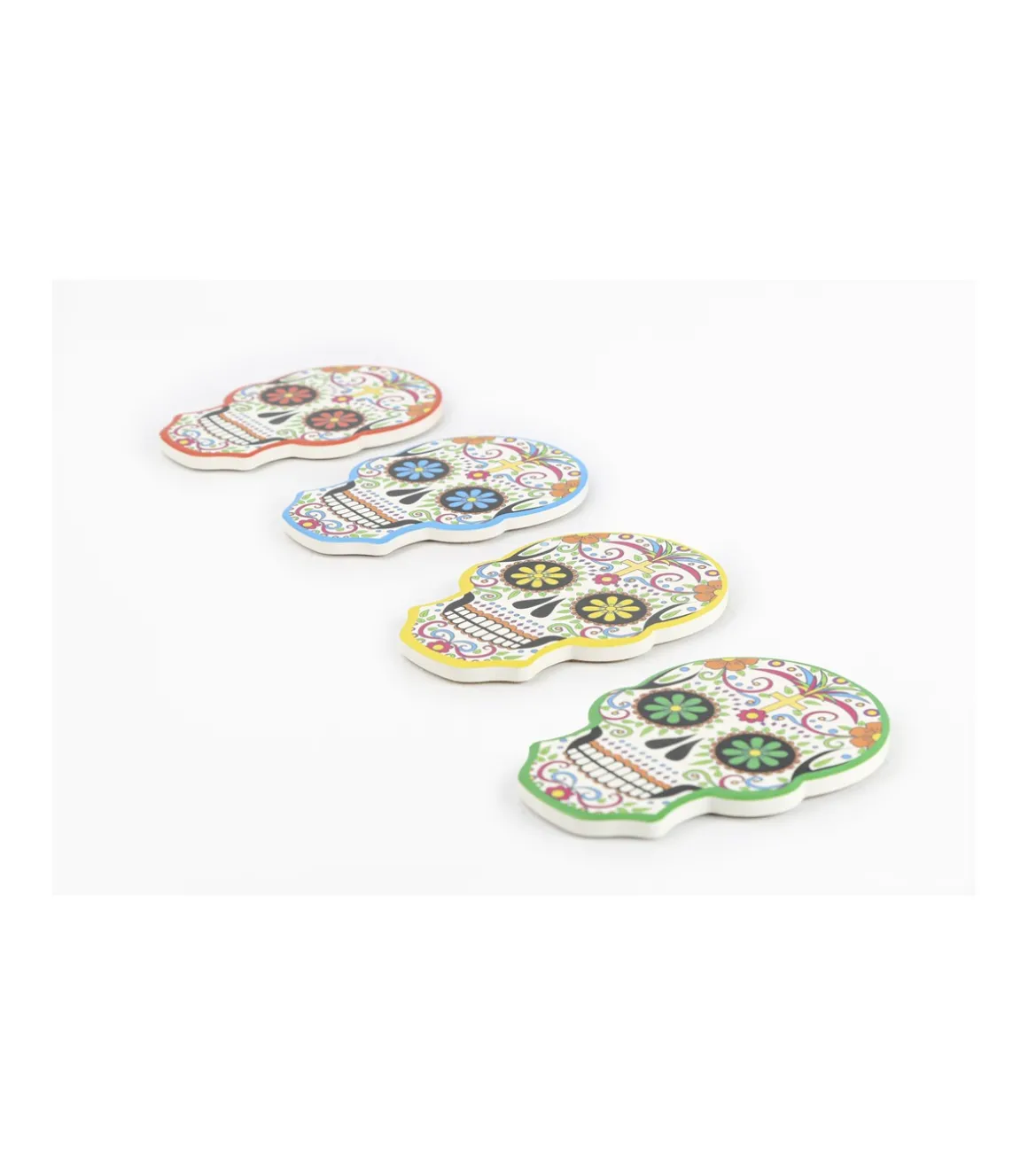 Set de 4 posavasos diseño calavera. Fabricado en domolita con acabado rígido de alta resistencia. Cada set incluye 4 diseños únicos en combinaciones de colores. Estos posavasos son el mejor aliado para foodlovers. ¿Tenías apetito de un diseño diferente?