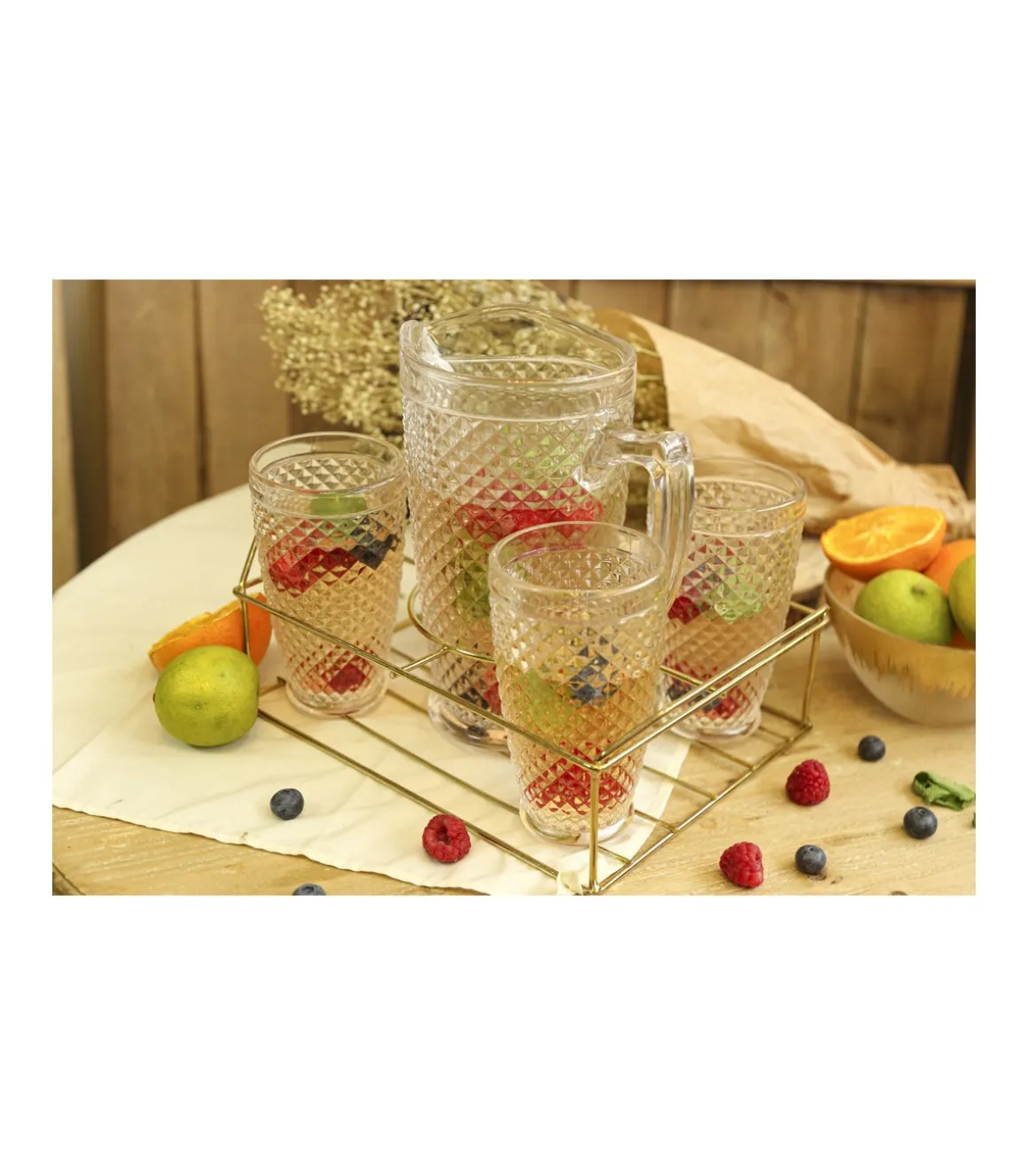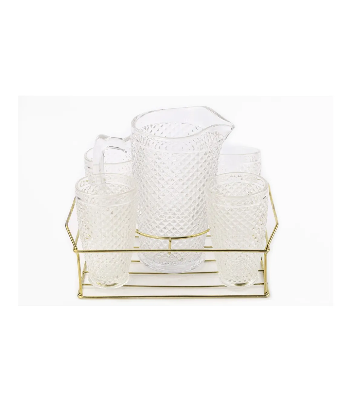 Set de jarra + 4 vasos diseño relieve. Incluye soporte metálico.