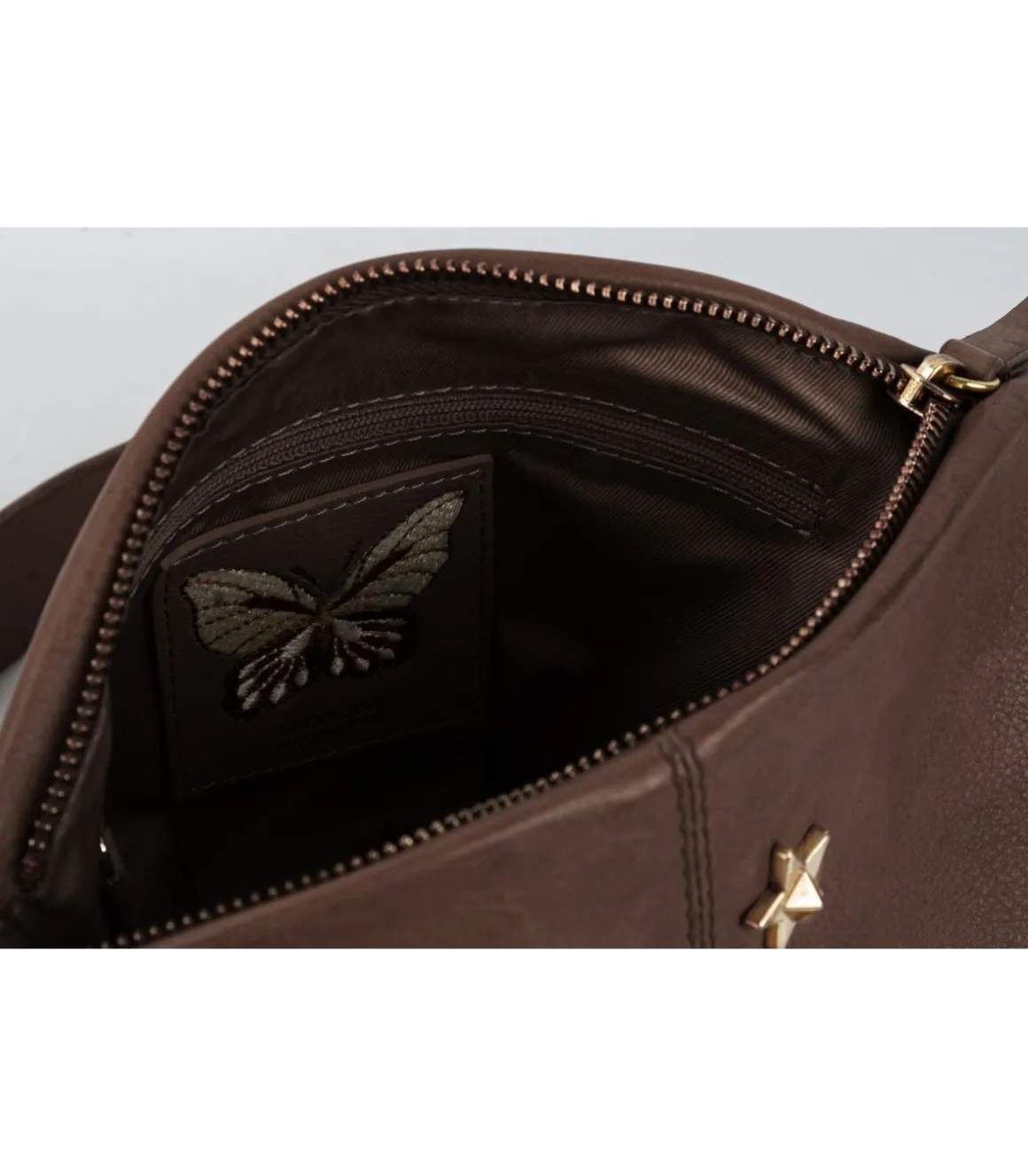 Bolso ligero y sofisticado. Interior forrado en poliéster brillante a tono, detalles de logo grabado con bordado de mariposas. Compartimento interior rematado con ribete en piel y bolsillo interior con cremallera.