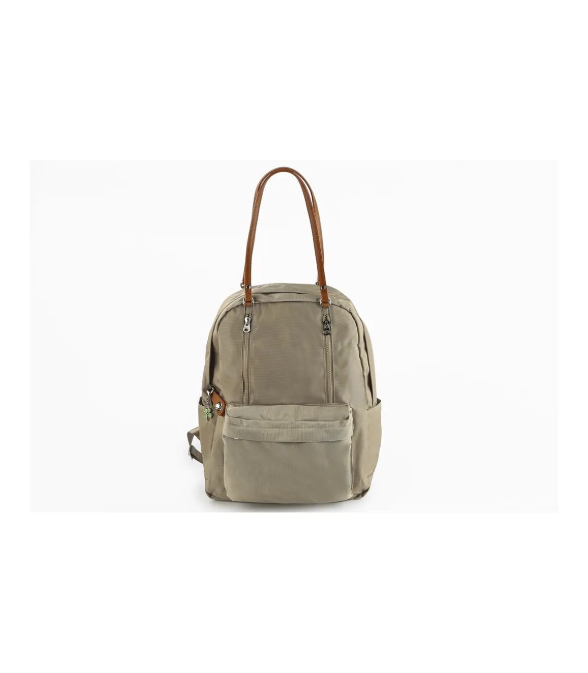 Bolso mochila fabricado en nylon hidrofugo, con efecto impermeabilizante ante la lluvia y ultrarresistente. Un diseño ultraligero, con amplia capacidad interior y cierre de cremallera con sistema de seguridad anti-hurto. Dos asas de piel para colgar al hombro y asas ajustables para llevar como mochila. Bolsillos laterales y delantero de fácil acceso.